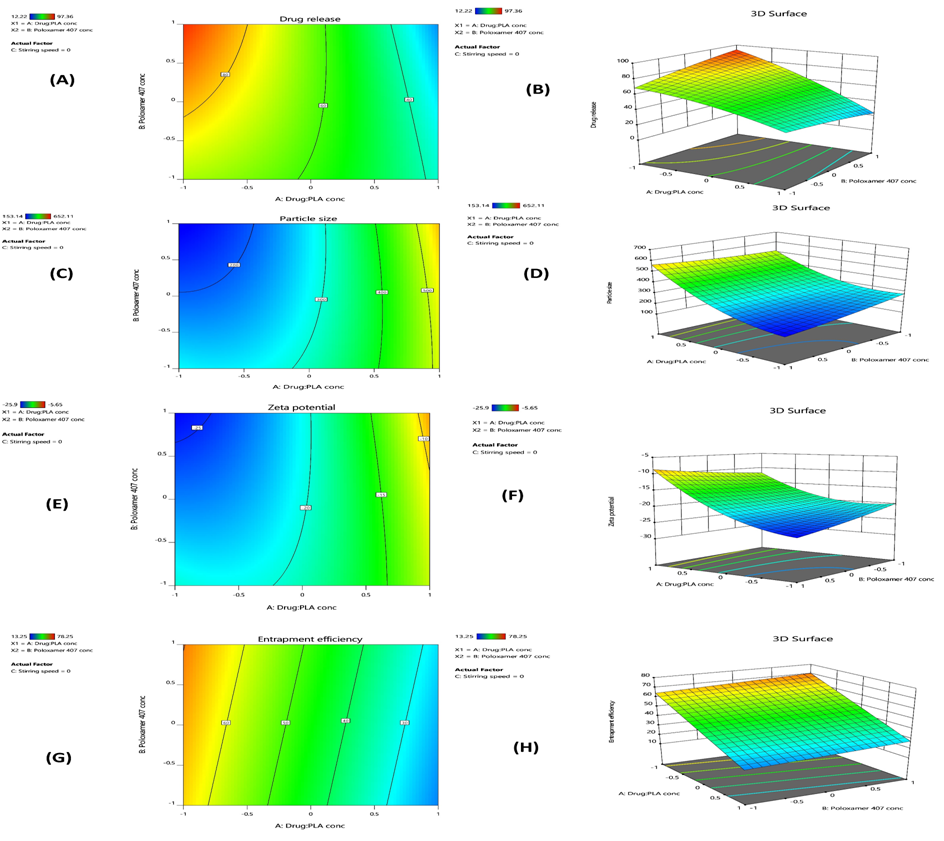 Effect of the factors on %drug release as CQAs: This was suggested by the reddish zone from the 2D and 3D plots, which is anticipated to be predominant at a low level (-1) of Drug and PLA ratio and a higher level (1) of stabilizer, i.e., Poloxamer 407 (%w/v), signifying greater than 90% release of drug in 24h, based on the simulations. The particle size and aggregation increased with the elevation in the polymer concentration, which was noticed in other trials with higher levels (1) of the Drug: PLA ratio. Thus, this prolonged the release process and significantly influenced the dissolution performance [32].