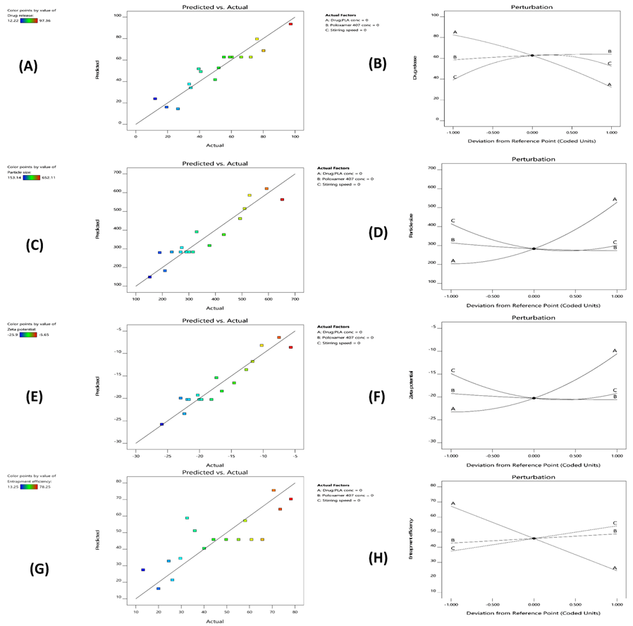 Fig. 3: (A) and (B) %Drug release, (C) and(D) particle size, I and (F) zeta potential and (G)and(H) % Entrapment efficiency for the predicted v/s actual plots and perturbation plots of the observed responses