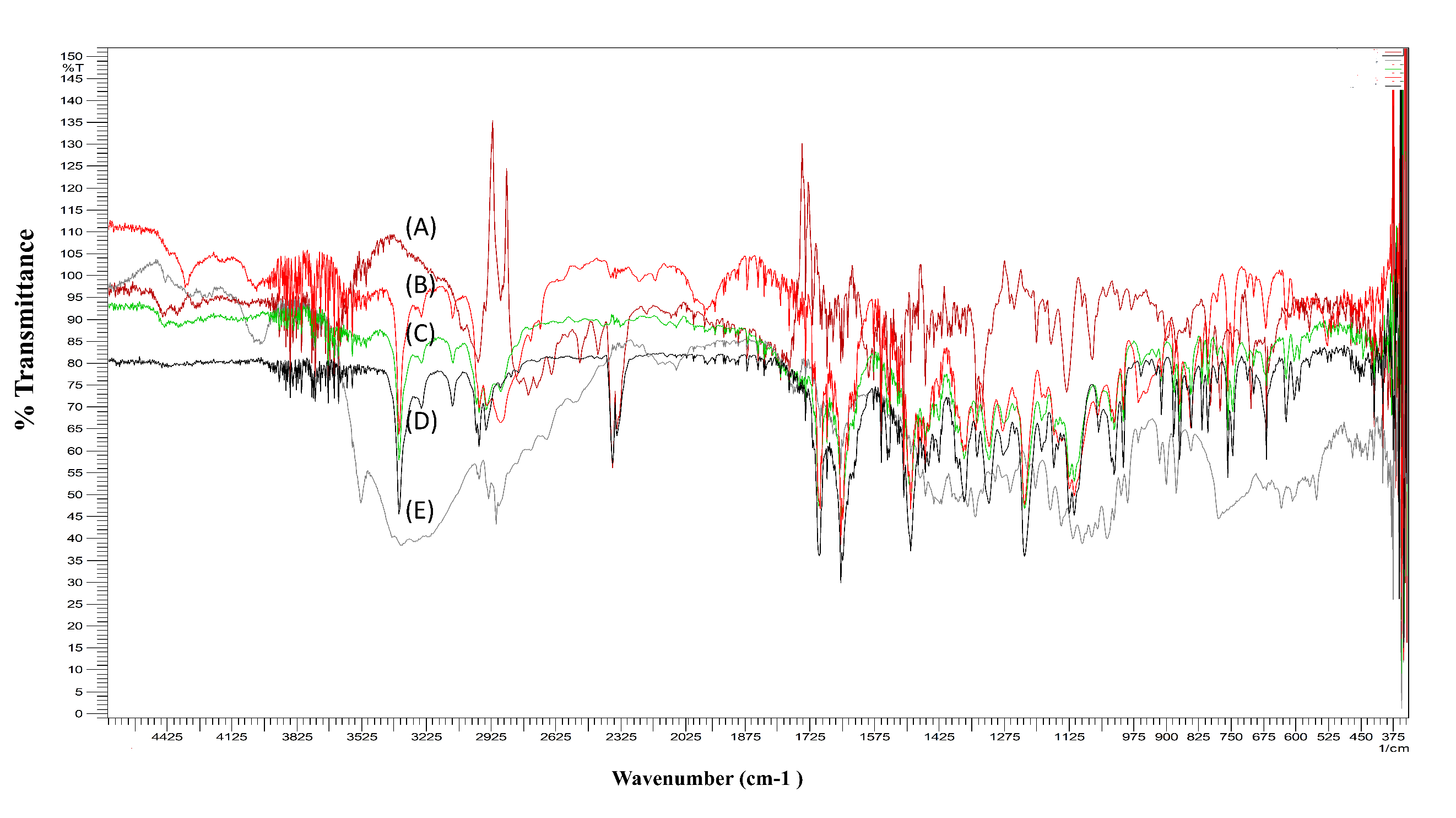 Fig. 5: FT-IR spectrum of (A) pure drug, (B) Poloxamer 407, (C) PLA, (D) Drug+polymer mixture (E) Formulated PLA-loaded nanoparticles