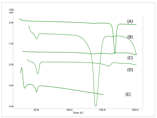 Fig. 6: DSC thermogram of (A) pure drug, (B) Poloxamer 407, (C) PLA, (D) Drug+polymer mixture (E) Formulated PLA-loaded nanoparticles