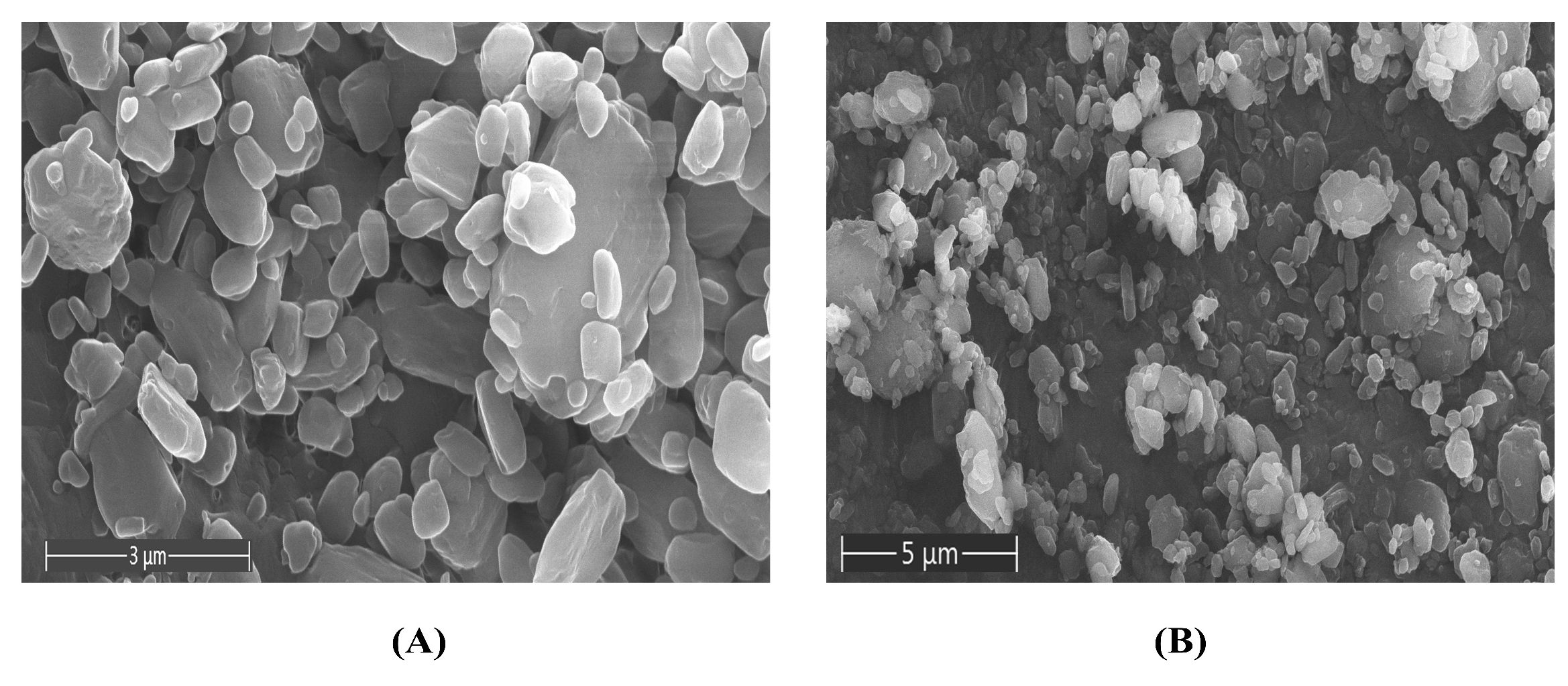 Fig. 9: Illustration of SEM (A) Isradipine (pure drug), (B) Freeze-dried polymeric nanoparticles