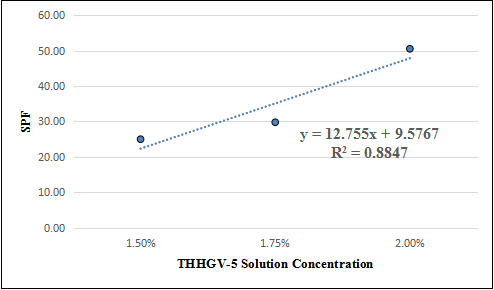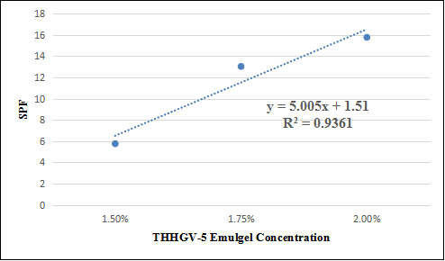The regression equation depicted in fig. 3 allows one to observe the relationship between THHGV-5 concentration and SPF value. According to the Kruskal-Wallis test analysis with a 95% confidence level, the SPF values of THHGV-5 emulgel differ significantly depending on concentration (sig. value 0.05).