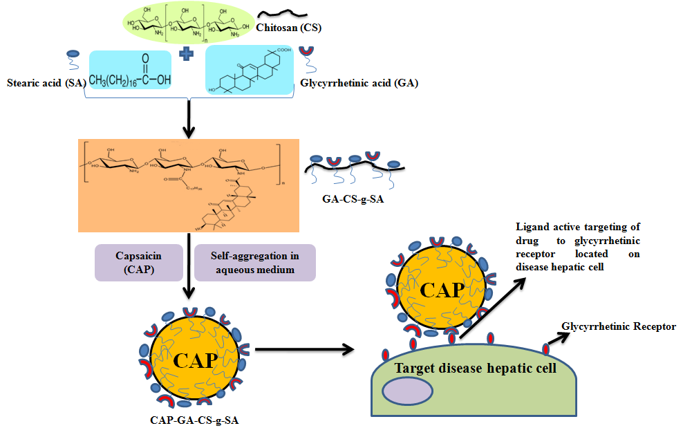 Objective: Capsaicin (CAP) is a naturally occurring alkaloid forecasted in the treatment of Alcoholic Hepatitis (AH), but least studied due to its hydrophobicity, low bioavailability, and less target-specific release. Hence, the present study aimed to synthesize glycyrrhetinic acid conjugated stearic acid grafted chitosan (GA-CS-g-SA) and prepare CAP-loaded GA-CS-g-SA micelles.