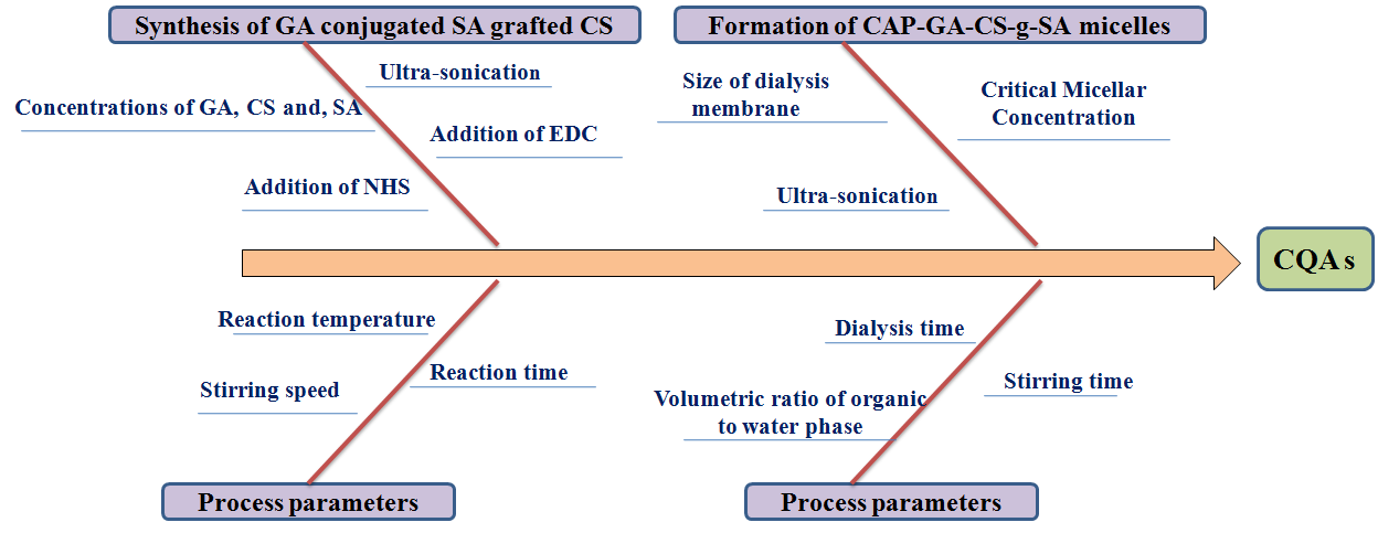 Early assessment of risk factors was initiated by preparing an Ishikawa (fishbone) drawing (fig. 2). It depicts the result of each parameter on the CQAs. Amongst various factors, the influential factors were measured for test trials [43].