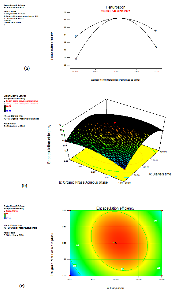 The effects of three controlled variables—dialysis duration (A), the volumetric ratio of organic to water phase (B), and stirring time (C)—on two response variables—encapsulation efficiency (EE) and particle size of CAP-loaded micelles—were investigated using the Response Surface Methodology with BBD [27]. The BBD got engaged to develop and examine main, interactive, and quadratic effects following variables influencing resultant parameters [28]. Seventeen experiments were produced by "Design-Expert® 11.0 (Stat-Ease Inc., Minneapolis, Minnesota, USA)" [23]. Conditions following experiments due to the trials are furnished in table 1.