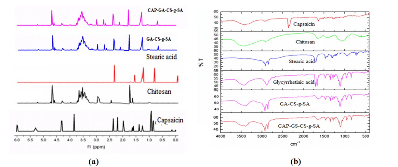 The structures of the CAP and polymers were established using 1H NMR and FTIR. Fig. 7(a) shows 1H NMR spectra of CAP, CS, SA, GA-CS-g-SA and CAP-GA-CS-g-SA. Spectra of GA-CS-g-SA presented a pointed signal at d=1.0 ppm; this was endorsed for–CH2–of SA. The chemical shift of 0.9 ppm and 1.0 ppm could be credited to the–CH3 hydrogen and methylene hydrogen of the stearate group, respectively. Thus, it has understood that SA was productively grafted to CS [46]. Similarly, the spectra of GA-CS-g-SA indicated added signal at d=3.5-3.65 ppm belonging to GA. From this, it is apparent how SA and GA functionally joined CS. 1H NMR spectra of CAP shows distinguishing peaks at 0.90 and 1.31 ppm attributed to −CH3 and −CH2− protons of CAP, respectively. All distinguishing peaks of CAP disappeared in both the polymer conjugates, indicating drug encapsulation in the hydrophobic core of the micelle [23].