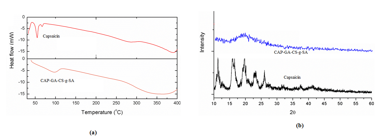 The free CAP and freeze-dried products of CAP-GA-CS-g-SA micelles were examined in solid state by XRD and DSC. XRD markings of samples are depicted in fig. 8(a). The diffraction peaks of CAP explain the crystalline character, whereas the disappearance of these peaks confirms the freeze-dried micelles' products and the latest solid state [48].