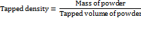 The tapped density was obtained by mechanically tapping a graduated measuring cylinder having 20 g of the prepared powder sample using bulk density apparatus till constant volume followed by calculations using the following formula [17]-