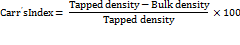 In pharmaceutics, Carr's Index (Compressibility Index) is frequently employed to measure a powder's compressibility. The difference between the bulk density and the tapped density in a free-flowing powder would be too tiny, and as a result, Carr's Index would be low. Instead, a poorly flowing powder with higher inter-particle interactions difference between the reported bulk density and tapped density would be more significant, leading to a bigger Carr's Index. Carr's Index was calculated using the following formula [17]-