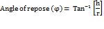For determination of the Angle of Repose, the powder was passed through a vertically aligned funnel, and the height (h) and radius (r) of the heap formed were determined and calculated the angle of repose using the following formula [17]-
