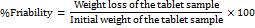 The friability test was performed to ensure the prepared tablets were mechanically sound and could withstand mechanical shocks during handling and storage. The apparatus used for the purpose was Roche Friabilator. The average weight of the tablets was 0.450 g, i.e. less than 0.650 g. So, the test was performed on a sample of whole tablets corresponding to ten times the average weight of tablets, i.e. 6.5 g. The tablets were de-dusted carefully and accurately weighed. The tablets were then allowed to fall 100 times from a 6-inch height in the rotating Friability Chamber at 25 rpm. Then the tablets were removed from the friabilator chamber, de-dusted and weighed accurately. Calculate friability using the following formula [10].