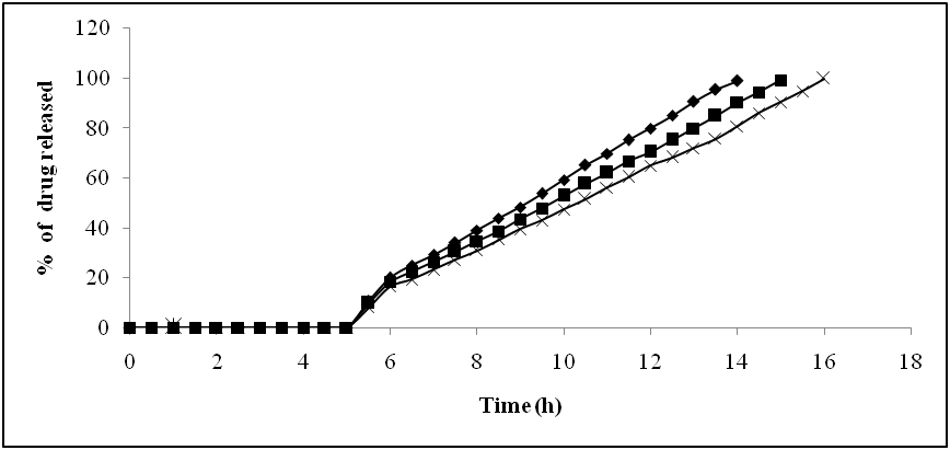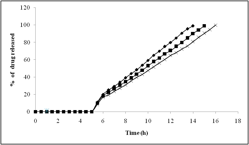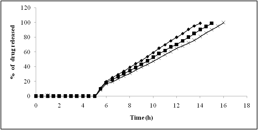 Formulated Hydrogel Plugs were characterized for uniformity of weight, hardness, thickness, lag time and the results were shown in table 3. The formulations fitted with the various hydrogel plugs HP1, HP2, HP3, HP4 showed 0.2%, 6.18%, 16.37% and 18.84% of drug release, respectively at the end of 5th hr. It was observed that 100 mg hydrogel plug (HPMC K100:Lactose in 1.0:1.0 ratio) having 4.5 kg/cm2 hardness was satisfactory to retard the drug release in small intestinal fluid and to eject out the plug in colonic fluid and releasing the microparticles into colonic fluid. This suggests that the lag time could also be adjusted and influenced by the plug composition [25].