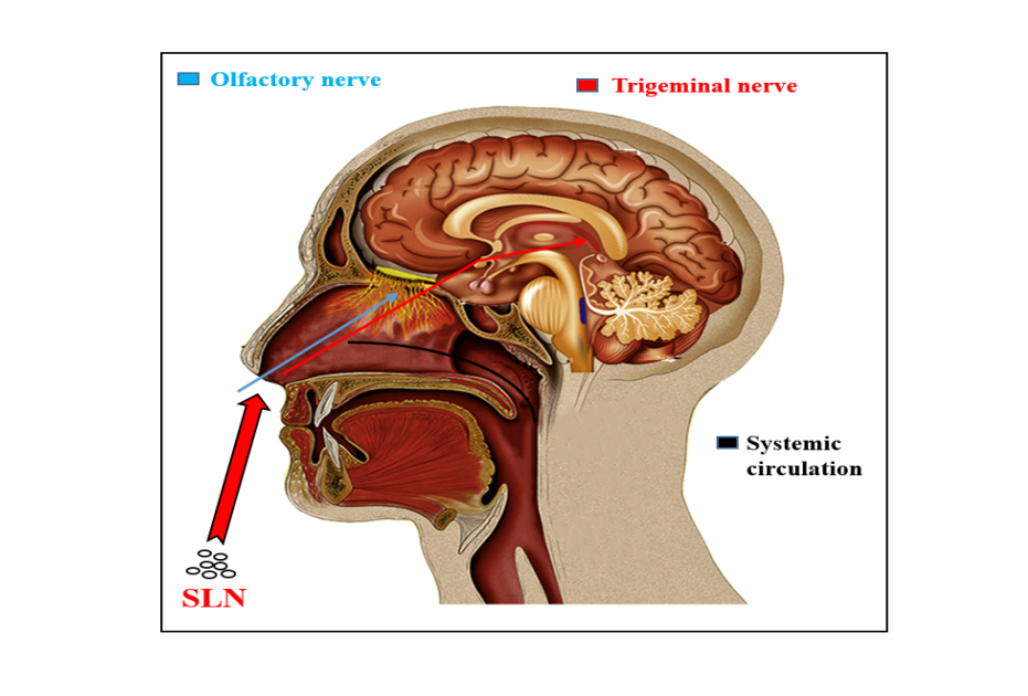 The last few decades have seen researchers increasingly interested in the exciting scientific area of delivering medications to the brain. However, the Blood Brain Barrier (BBB), which creates an endothelial membrane separating the systemic circulation from the Central Nervous System (CNS), prevents drugs from reaching the brain's site of action [1]. A monolayer of tightly interconnected endothelial capillary cells makes up the BBB, which facilitates the selective entry of nutrients and hormones while preventing the passage of infections, poisons, and other foreign substances, such as medications. The therapeutic agent must first cross the BBB to reach the CNS after being administered orally or systemically. Active transport and passive diffusion (paracellular or transcellular) via endothelial cells are the primary routes through which substances reach the brain. Similar to this, tight junctions make the BBB impenetrable to big molecules and most low molecular weight (Mw) molecules, enabling only smaller and highly lipophilic molecules to get through [2, 3]. Therefore, a variety of strategies are used to target drugs to the brain, which include osmotic and biochemical disruption of BBB, drug modification like lipophilic analogues, prodrugs, chemical drug delivery, carrier-mediated delivery, and receptor/vector-mediated drug delivery, and alteration of the route of administration, including intracerebroventricular, intrathecal, and olfactory pathways (intranasal route). The intranasal route is being investigated in the current context because it offers a unique, useful, easy, and non-invasive method of breaching the BBB and minimizes systemic exposure and, ultimately, systemic unfavourable effects [4, 5]. Due to the neurological relationship between the nasal mucosa and the brain, the drug penetrates the olfactory epithelium region of the nasal mucosa after being administered intravenously, which serves as a doorway for drugs entering the CNS [6]. Solid Lipid Nanoparticles (SLNs) are made up of a colloidal solid lipid core matrix that is stabilized and emulsified in an aqueous medium by a surfactant. High drug Entrapment Efficiency (EE), smaller particle size, and huge surface area are what set them distinct [7]. Due to their ability to protect the drug from biological and/or chemical degradation and potential to prolong nasal retention time due to an occlusive effect, favourable application characteristics, and SLN’s adhesion to mucous membranes, SLNs can provide advancement to conventional Nose-to-Brain (NTB) drug delivery [8].