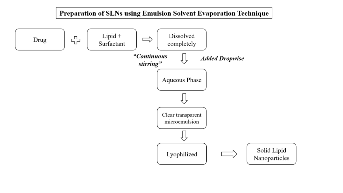 By using a modified solvent emulsification-diffusion process, drug-loaded SLNs were manufactured. As the internal oil phase, accurately weighed lipid was dissolved in a 2.5 ml combination of ethanol and chloroform (1:1). The drug was dissolved in the above solution. The external aqueous phase, which was 22.5 ml of an aqueous solution of Tween 80, was then added drop by drop to this organic phase, and the mixture was homogenized for 30 min at 3000 rpm to create a primary emulsion (o/w). Pouring the above main emulsion into 75 ml of ice-cold water that included surfactant and stirring helped to properly solidify SLNs and remove the organic solvent into the continuous phase. To distribute the SLNs, the stirring was kept up for a further 2-2.5 h at 3000 rpm. To create SLN dispersions of a consistent size, the SLN dispersion was sonicated for 5 min (1 cycle, 100% amplitude). The solid lipid material containing the drug was then separated from the dispersion using a centrifuge at 18,000 rpm for 20 min. The dispersion was then repeatedly rinsed with deionized water to confirm that all organic solvents had been completely removed. To create the SLNs, this was redispersed in 1.5–1.625 percent (w/v) of an aqueous Tween 80 surfactant mixture and sonicated for 5 min. To preserve them from freezing, 5% (w/v) mannitol was added to the SLN dispersions before lyophilization [33].