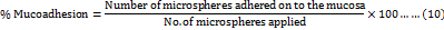 According to the monograph, the mucoadhesive property of the microspheres is assessed on the goat's intestinal mucosa by utilizing phosphate buffer pH 7.4 (PBS) support. Gauged microspheres are spread onto wet flushed tissue example, and quickly from that point, the slides are clung to the arm of a USP disintegration test machine with reasonable uphold at 37 °C. The heaviness of microspheres drained out at various spans is estimated. The % mucoadhesion is determined by the following equation-10 [27].