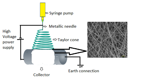 The electrospinning technique allows the formation of nanofibers from polymeric solutions under the influence of a high-voltage electric field [26]. A typical electrospinning apparatus shown in fig. 1 includes a high-voltage power supply system, a spinneret system (syringe with a metal needle), and a collecting system.