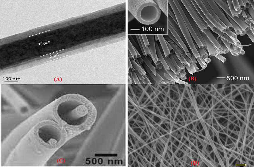 Fig. 2: Various structures of electrospun fibers (A) core-shell fibers prepared by coaxial electrospinning [31] (B) Hollow nanofibers with walls [32] (C) Nanowire-in-microtube structures [33] (D) 3D fibrous scaffold [34]