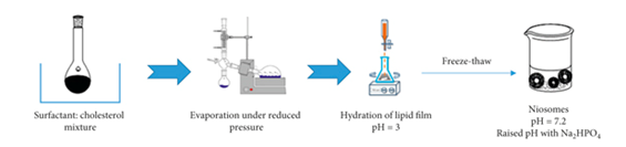 The general method of niosomes preparation is by hydration of nonionic surfactants using a hydration medium. However, they are prepared by several techniques, such as, transmembrane pH gradient method, lipid layer hydration, reversed-phase evaporation, EER injection, bubbling of nitrogen, sonication, the enzymatic method, the single-pass technique, and microfluidization which are defined here in depth [27].