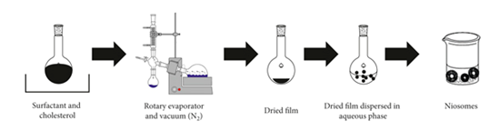 As shown in fig. 5, surfactant and cholesterol are dissolved in chloroform and evaporated under reduced pressure to produce a thin lipid film on the wall of a round-bottomed flask. The obtained film was hydrated with an aqueous solution of drug at a temperature slightly above the phase transition temperature of the surfactants under moderate shaking conditions. Several variables were validated that comprise the mass per batch, angle of evaporation, rotation speed of the vacuum rotary evaporator, and the hydration procedure. The latter variable was developed by various solvents (water, phosphate buffer (PB), and PB/drug) and hydration temperature below and above the gel transition temperature. Sathali and Rajalakshmi prepared terbinafine niosomes by thin film hydration and settled this procedure, which, upon sonication, produced small unilamellar niosomes (EE = 85%) [30].