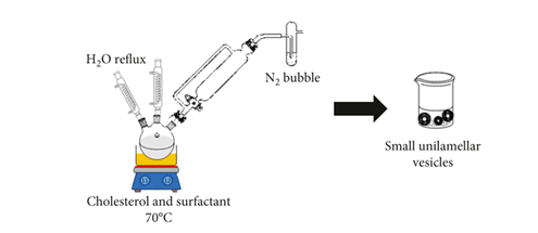This method is a new procedure for the one-step establishment of niosomes lacking the usage of any organic solvents. Using this buffer, cholesterol and surfactant are spread together (pH 7.4) at 70 °C conditions. It presumed by a round-bottomed flask with three necks. The first two necks are placed in water-cooled reflux to control the temperature. Due to the sample (cholesterol and surfactant) of homogenized nitrogen gas was passed from the third neck. Thereby, large unilamellar vesicles were produced. A continuous stream of nitrogen gas bubbles is made and introduced through the dispersion and to give small unilamellar vesicles (fig. 7) [34].