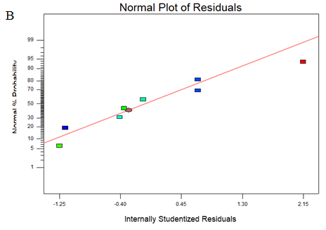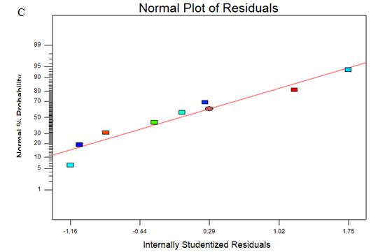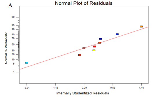 Average probability plot residuals for particle size, zeta potential, and spreading capacity are represented sequentially in fig. 1A, 1B, and 1C. The outcome mainly received comes on a direct line, showing that the results gained are normally distributed and properly equaled with the regression pattern [27].