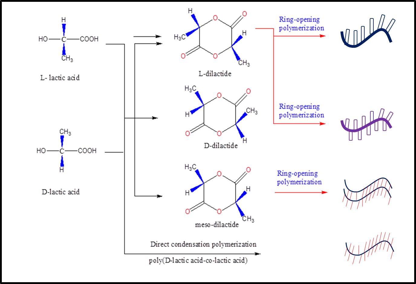 The first step in the biological process of making PLA is to turn plant-based polysaccharides into glucose. Next, lactic acid is made by fermenting glucose, which turns glucose into lactides when certain catalysts are present. Lactide, a ring formed from lactic acid dimers, is used to produce high-molecular-weight PLA in the ring-opening polymerization route and, therefore, is an important intermediate in the industrial production of PLA [18]. Due to the chiral nature of lactic acid, lactides exist in two main forms: L and D-lactide. By the synthetic route, after purification by vacuum distillation, the lactide is converted into the PLA polymer through polymerization in the presence of an appropriate catalyst. After conversion, two types of PLA are obtained: PLLA (low molecular weight) and PDLA (high molecular weight, fig. 2) [20, 22, 23].