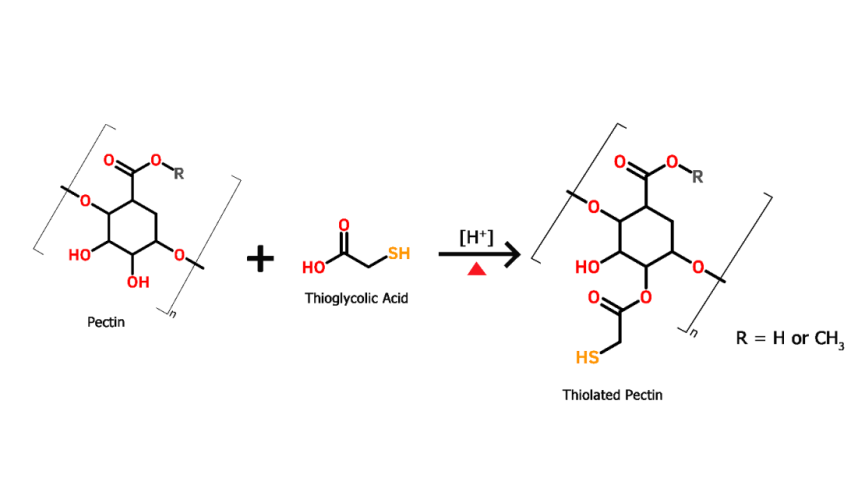 Past studies have performed pectin thiol modifications through amide bond formation [19], ester bond formation [26], and preactivation methods [27]. Among these, esterification of the hydroxyl groups of pectin with thioglycolic acid results in thiol group-bearing pectin and shows promising potential due to ease of production and minimum toxicity [26].