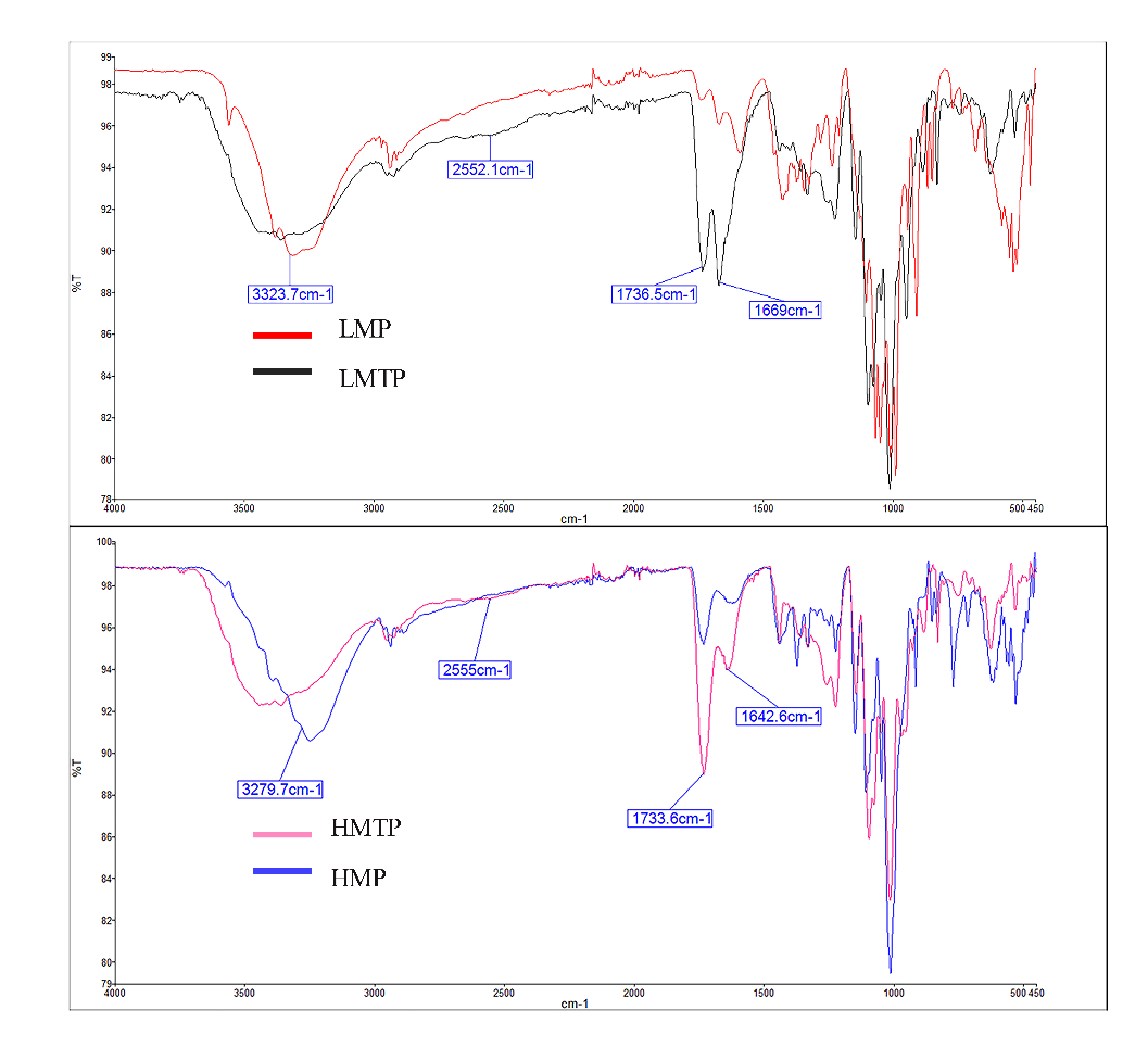 In agreement with the result in fig. 1, the FT-IR spectra shown in fig. 2 exhibited higher intensity for ester groups in modified pectin compared to non-modified pectin. The spectra of LMTP (fig. 2 top, black line) showed intense carboxyl and ester bands at around 1700-1630 and 1750-1730 cm-1, respectively, compared to LMP (fig. 2 top, red line) [34]. This signified that a higher amount of ester groups was present in LMTP based on the higher intensity of the ester band at 1733 cm-1, confirming the success of the esterification. The same results were observed for HMTP (fig. 2 bottom, pink line), which exhibited higher intensity bands at a wavenumber of 1733 and 1669.5 cm-1 corresponding to higher amounts of ester and carboxylic groups, respectively, compared to HMP spectra (fig. 2 bottom, blue line). Moreover, the presence of-SH weak-broad signature peak was observed at around 2600-2550 cm-1 in both LMTP and HMTP, but none in LMP and HMP. Although the bands were not prominent, they did not reflect the exact amount of the-SH group available. Instead, they were the natural molecular vibration pattern of the thiol group [26, 34].