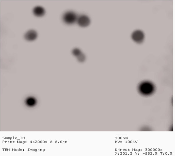 Analysis was performed at an accelerating voltage of 200kV. The sample was placed onto carbon-coated copper grid (200 mesh) to create thin film. Then samples were negatively stained with 2% w/v phosphotungstic acid solution. Excess droplets were removed. The grid was allowed to dry. Soft imaging viewer software was used to capture the image of samples [19].
