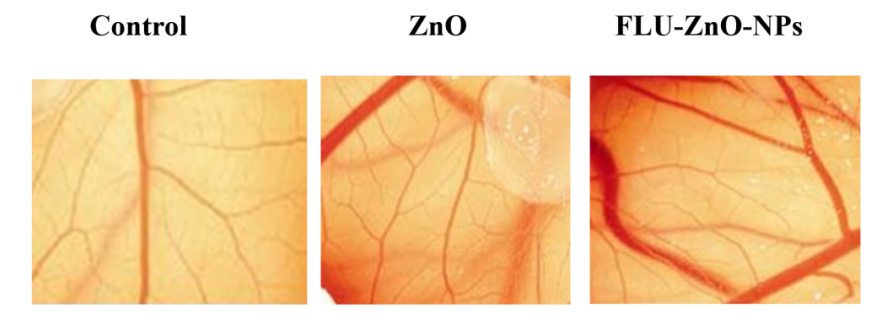 CAM assay was performed to evaluate the angiogenic activity of ZnO. CAM assay proved that ZnO enhanced the formation of new blood vessel formation that shows the pro-angiogenic effect in comparision with that of control in fig. 6.