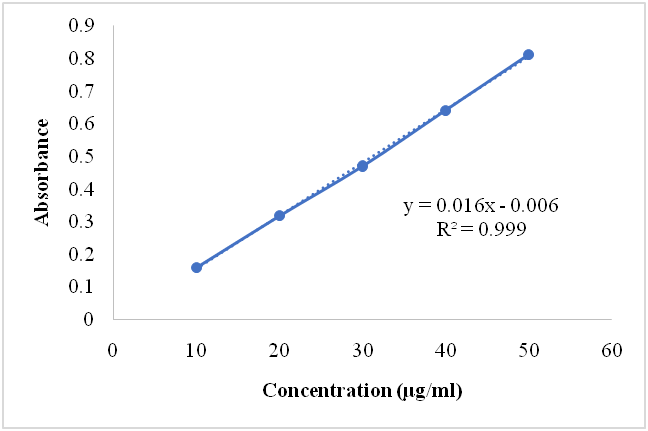 A calibration curve for riboflavin was constructed using different concentrations of the drug in 0.1 N HCl buffer. The concentrations ranged from 10 to 60 μg/ml absorbance readings were taken for each concentration and a linear relationship was observed between the concentration and absorbance, with a very high correlation coefficient (r2) of 0.999. This indicates that riboflavin exhibited excellent linearity within this concentration range in 0.1 N HCl buffer [26]. The equation derived from the calibration curve (y = 0.016x-0.006) was later used to determine the drug content in the formulations and evaluate the percentage of drug release from the formulations during the in vitro dissolution studies. The calibration curve is shown in fig. 1.