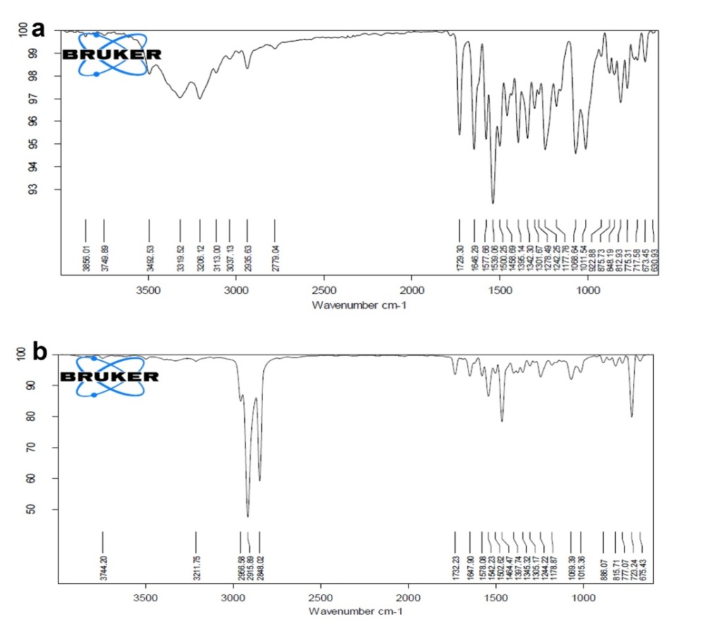 Fig. 2: FTIR spectrum of a. Riboflavin b. Riboflavin+Carnauba wax