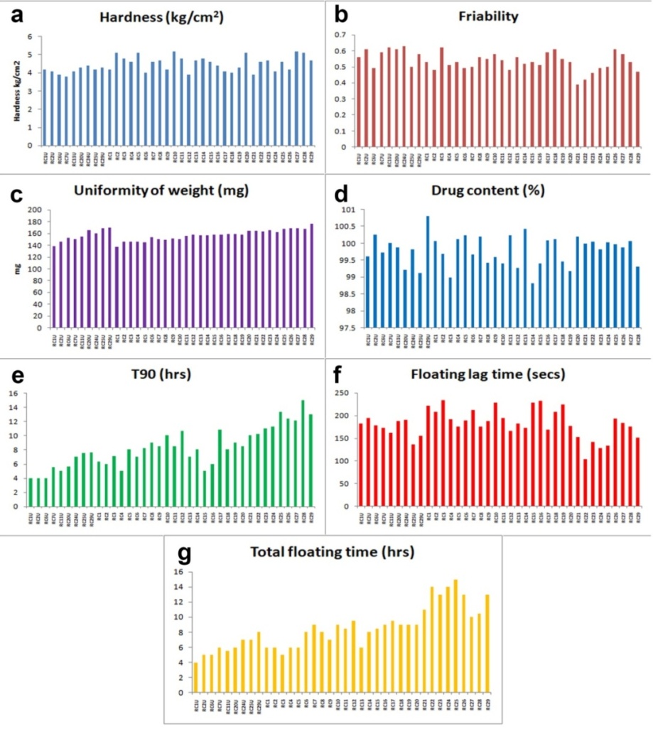 Fig. 4: Results of post-compression parameters a. Hardness b. Friability c. Uniformity of weight d. drug content e. t90 f. Floating lag time g. Total floating time. Data is given in mean, n=3