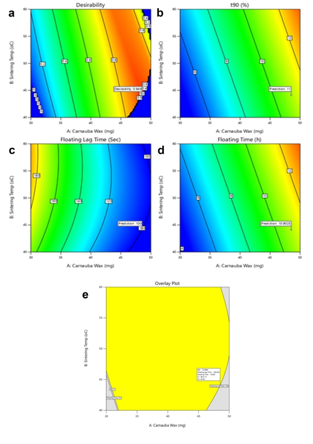 Fig. 6: Response surface plots of a. desirability b. t90 c. floating lag time d. floating time e. overlay