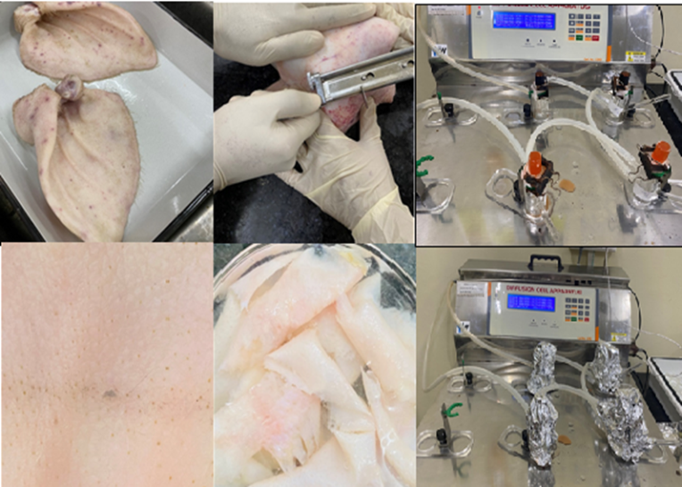 As shown in fig. 3, a piece of skin of 1 mm thickness was placed on the Franz diffusion cell. The permeation studies were used to calculate the drug's flux and permeability coefficient. Pig ear skin was used in skin permeation studies because it exhibits permeability characteristics that are comparable to those of human skin.