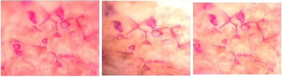 Research on in vitro skin implantation employed porcine skin of pigs that was rapidly collected after pigs were killed at a nearby slaughterhouse. Porcine skin was cleaned using ice-cold water and then the impacted skin was scraped off. To create full-thickness skin membranes, the whole skin was removed from the cartilage beneath. Before the diffusion testing, defrosted skin was cut into 2*2 cm squares. The skin samples were firmly fastened using thumbtacks prior to the surface of the microneedle arrays adhering. equivalent to putting a stamp into an envelope or a lift button with force, the skin was physically treated with microneedles for 30 sec. After that, the compression site was pulled off and given a minute-long exposure to a fluorescent dye. The leftover dye was removed from skin samples that were processed for histological examination. For histology specimen preparations, the skin was fixed in formalin, dried, and combined with paraffin. Methylene blue dye was used to colour skin samples, which were then examined using an olympus fluorescence microscope. to gauge penetration depth as reported in fig. 11.
