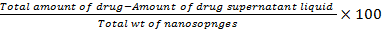 The amount of drug loaded in the unit weight of the SIM nanosponges was denoted by drug loading capacity. % EE [28] refers to the total amount of drug entrapped in the nanosponge formulation. In 10 ml of phosphate buffer (pH–6.8), approximately 50 mg of SIM nanosponges were completely dissolved. The transparent drug layer was then collected, and its concentration was determined using a UV-visible spectrophotometer. The following formula was used to calculate the drug's % EE and % drug loading capacity in nanosponges [29].