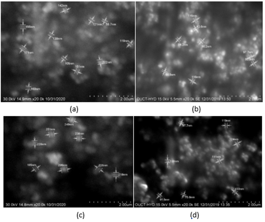 Fig. 3: SEM images of prepared nanosponges formulations (magnification scale 2.00 µm) a) SF4 b) SF7 c) SF8 d) SF12