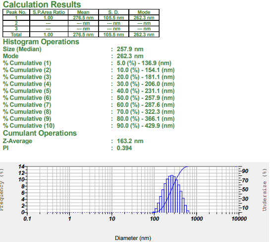 The formation of nanosponge (SF1-SF13) was achieved with particle size ranging from 142.45±0.35-295.23±0.81 nm. The optimized formulation (SF14) has an average particle size of 163.2±0.45 nm with 0.394 PDI (fig. 6). SF14 indicated a zeta potential of-6.6 mV (fig. 7). These results showed that the particles were nano in size and separated by repulsive forces.