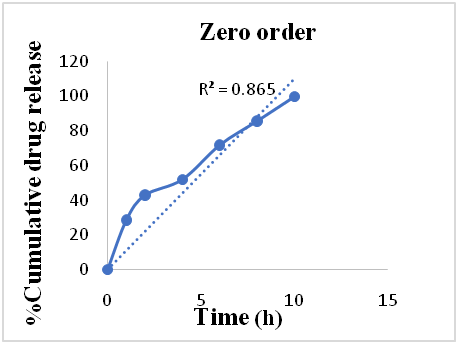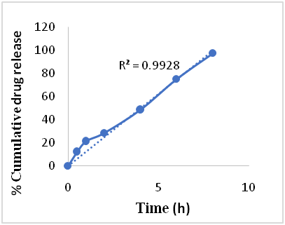 In vitro drug release study exhibited 87.7±0.45 to 99.77±0.23% of drug release for all SIM nanosponges (SF1-SF13) up to 8h (table 3). The optimized formulation (SF14) showed 97.13±0.38% of drug release in 8h (table 8). The drug release pattern of optimized formulation (SF14) was graphically demonstrated in fig. 8, which indicated a linear relationship with a correlation coefficient (r2) of 0.9928.