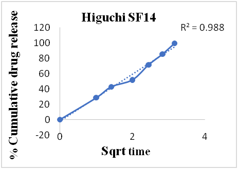 Drug release kinetics for the optimized formulation (SF14) fitted for dissolution models the best, and the coefficient (r2). It showed zero-order kinetics with the Higuchi diffusion mechanism.