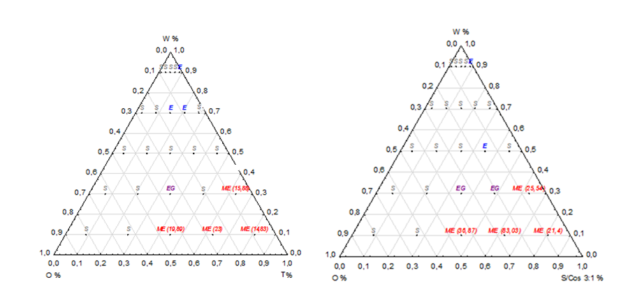 Abbreviations: ME: microemulsion, EG: gel emulsion, E: emulsion, S: phase separation, W: water, O: oil, S/Cos: surfactant/cosurfactant, T: Tween 80.