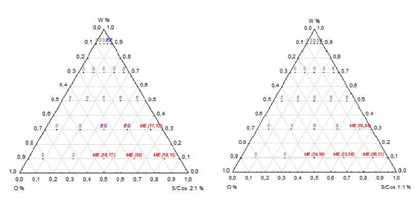 | O% | W% | S% | Cos% | Phase separation/ Centrifugation at 3000 rpm |