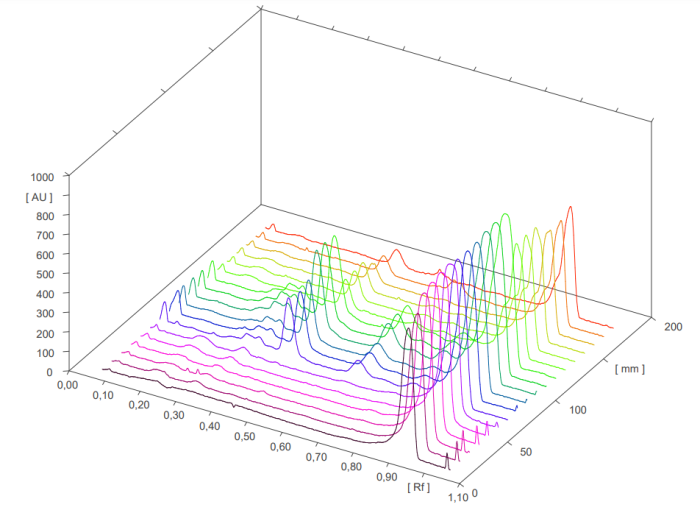 Densitometric scanning was performed at a wavelength of 249 nm using the Camag TLC Scanner III in reflectance-absorbance mode and operated with CATS software (1.4.4 6337, Camag). A deuterium lamp was used as the radiation source, producing a continuous UV spectrum between 200 nm and 400 nm. The slit dimensions were 8 mm × 0.4 mm, and the scanning speed was set at 10 mm/s. The scattered light intensity was used to determine the concentration of the chromatographed substance. Peak areas were determined using linear regression [12].
