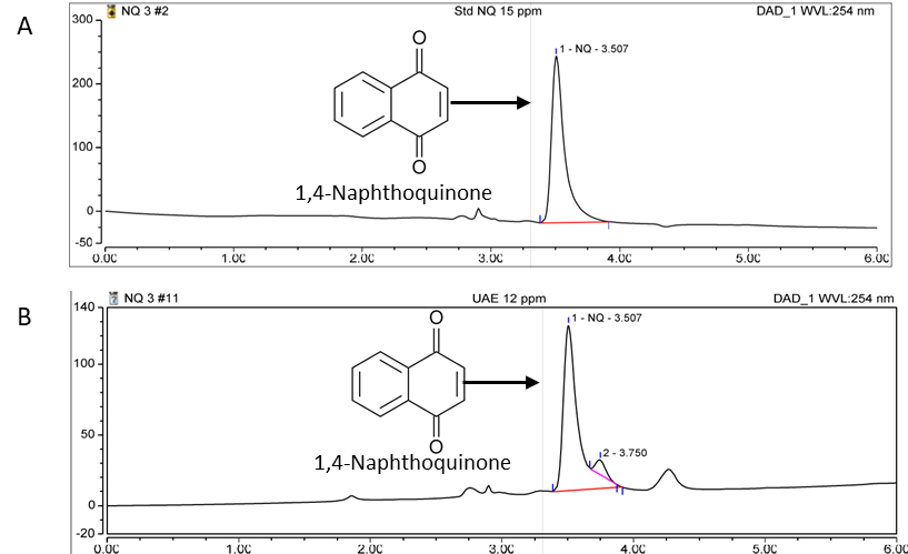 Approximately 12 μg/ml of the extract is used to measure the content of 1,4-naphthoquinone. It is filtered into vials using a syringe and a 0.45 μm filter. The calculation of 1,4-naphthoquinone content in the extract solution is performed using Chromeleon software version 7.2 for each sample with three replicates.