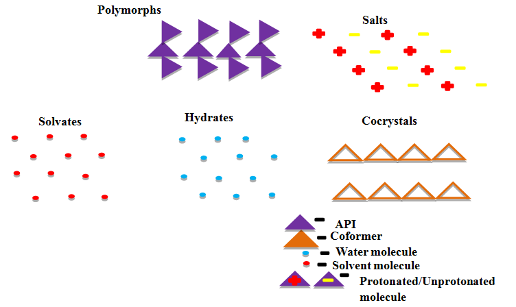 For instance, only substances with the right ionizable groups may form salts, and hydrates and solvates often lose their stability over time because aqueous and solvent substances are prone to loss. In contrast, any API may create cocrystals when working with the right coformer. Pharmaceutical cocrystals have received focus from the pharmaceutical company and academia in the previous 20 y because they can change the crystal structure of APIs without changing their pharmacological characteristics, hence improving their physicochemical properties [11, 12]. Several pharmaceutical crystals, like Steglatro, have been authorized thanks to the advancement of the cocrystal sector, and others are now undergoing clinical trials [13-16].
