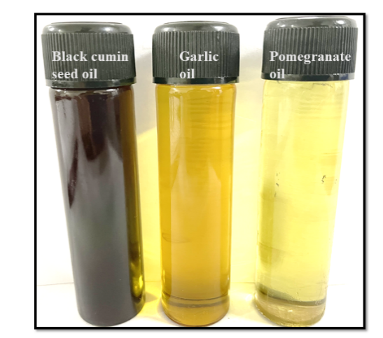 The chosen different oil phases such as Black cumin, Garlic, and Pomegranate oil (fig. 1) were combined with 250 µl of each chosen different surfactant. The mixes were slowly heated between (25 °C and 40 °C) to homogenize the ingredients. The resultant fine emulsion was created by adding the ratio (1:1:48-1:9:40) of oil with surfactant and Milli-Q in a stoppered volumetric beaker in a magnetic stirrer between 100-130 RPM. The number of flask inversions essential to produce a homogenous emulsion was used to determine how easy an emulsion was to produce [19]. The produced emulsions were left to remain overnight and their turbidity was measured spectrophotometrically The Date and Nagarsenker method [20] was to test the emulsification optical density (OD) of various at 600 nm using a UV spectrophotometer (JASCO V-630) with Milli-Q water used as a blank. Additionally, turbidity and phase separation in the emulsions were visually checked.