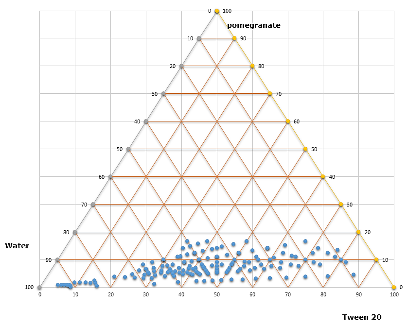 Fig. 3(A): Ternary phase diagram construction of nanoemulsions: oil (Pomegranate), Surfactant (Tween 80), and, Mili-Q