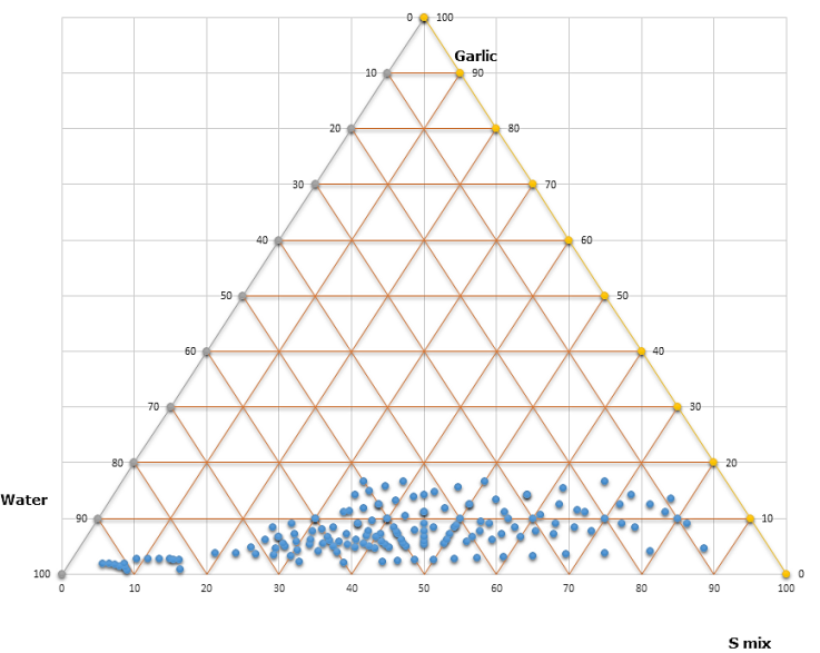 Fig. 3(B): Ternary phase diagram construction of nanoemulsion: Oil (Garlic), S mix (Cremophore EL and Brij 35), Mili-Q
