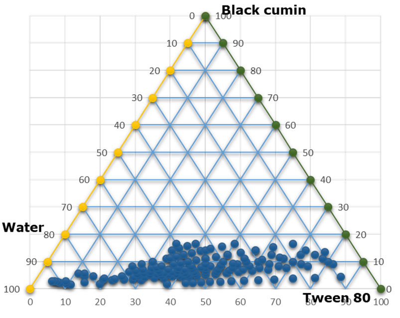 Fig. 3(C): Ternary phase diagram construction of nanoemulsion: Oil (Black cumin seed oil), Surfactant (Tween 80), and Mili-Q